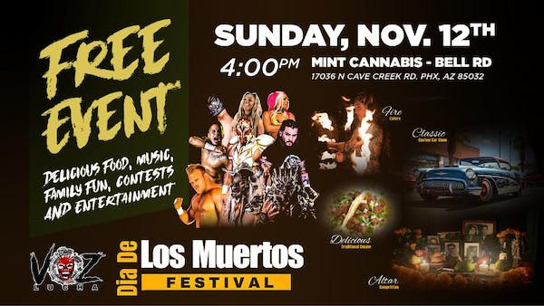 WHAT: To commemorate the Día de los Muertos tradition, which originated in Mexico and is traditionally celebrated on Nov. 1 and 2, Mint Cannabis is teaming up with event and entertainment promoter Lucha Voz and Catri – a local cannabis edibles company that makes THC-infused gummies in nostalgic, Latin-American flavors – to host the third-annual Día de los Muertos parking lot festival on Sunday, Nov. 12 in north Phoenix. The free one-day festival, hosted in the northwest parking lot at Cave Creek Road and Bell Road in north Phoenix, will offer a lot of interactive entertainment and visuals, including: