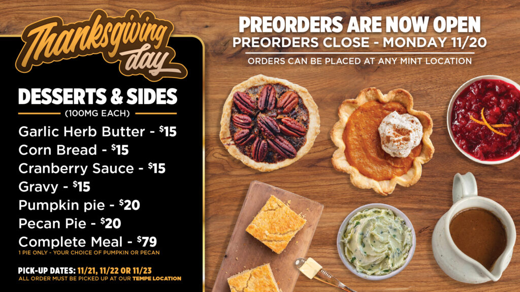 - Adults ages 21 and older can order cannabis-infused Thanksgiving side dishes (100 mg each) from any of the Mint’s six Valley dispensaries. This includes gravy (4 oz.), Cranberry Sauce (4 oz.), Garlic Herb Butter (4 oz.), and Cornbread (5-inch) for $15 each. Sides and pies must be ordered by Monday, Nov. 2, for pickup at the Mint’s cannabis kitchen in Tempe between Nov. 21 and 23.